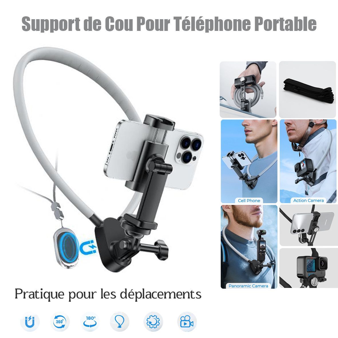 Compatibilité : Le support est polyvalent et conçu pour s’adapter à plusieurs types de caméras et d’appareils :